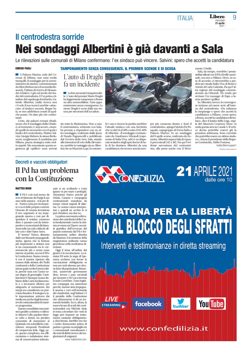 Di seguito trovate il link per scaricare l’articolo pubblicato nel quotidiano Libero in data mercoledì 21 aprile 2021, intitolato “Il Pd ha problemi con la Costituzione”.